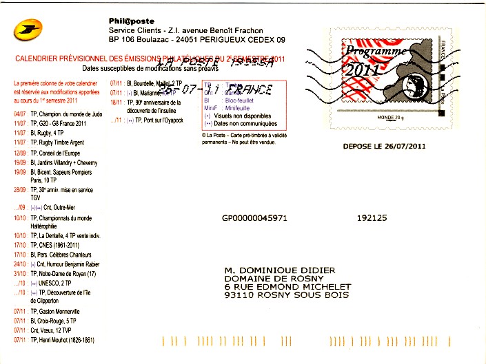 | 17 | ![]() ![]() 2011 : EFR O 16 carte Carte pour annoncé le programme philatélique |
