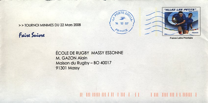 ![]() 2007 : EFR P 177BS Enveloppe Tournoi Minimes du 22 mars 2008 |